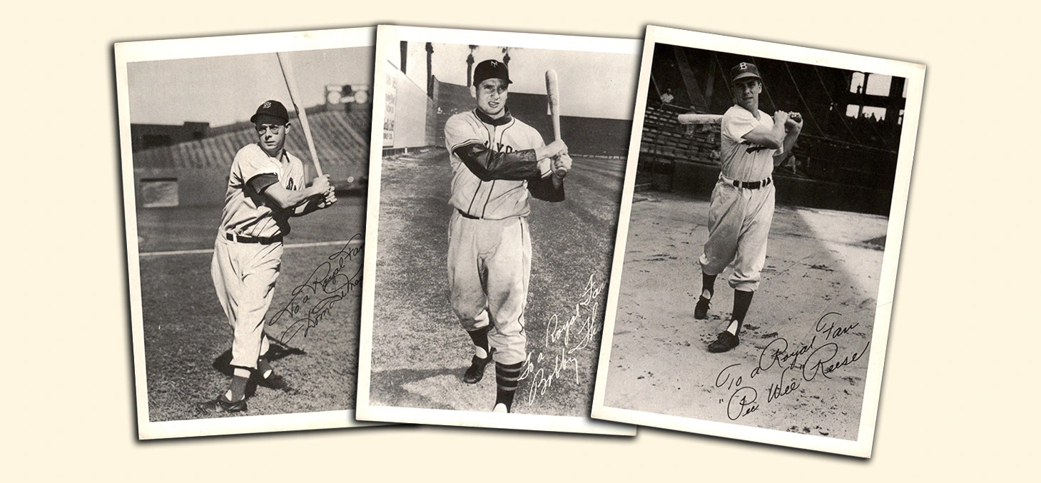 The 1952 Royal Desserts Premiums Set contains just 16 cards that measure 5" by 7", and contain a black and white photo on the front with a facsimile signature from the player, along with the tagline, "To a Royal Fan". These blank backed cards were produced in the final year of a 3 year promotion from the Royal Desserts Company that included cards found on boxes of desserts.