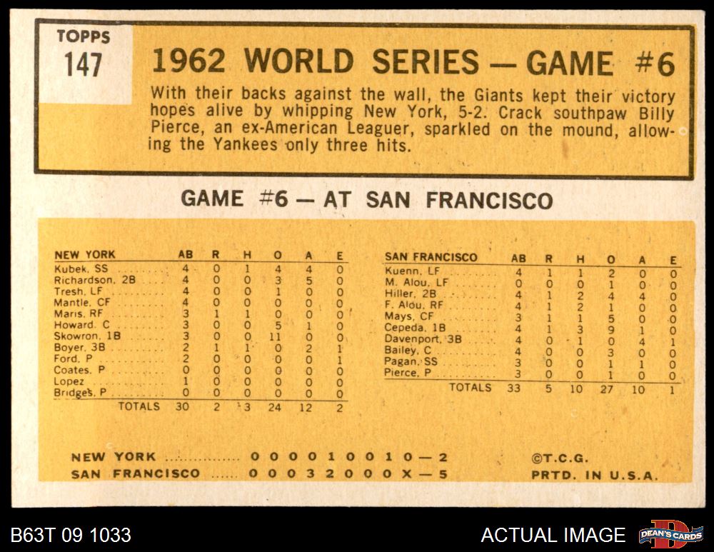 1963 Topps #147 1962 World Series - Game #6 - Pierce Stars in 3-Hit Victory - 6 (EX/MT