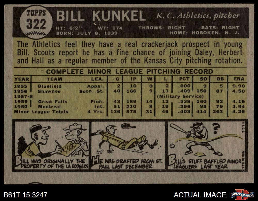 1961 Topps #322 Bill Kunkel 4 - VG/EX