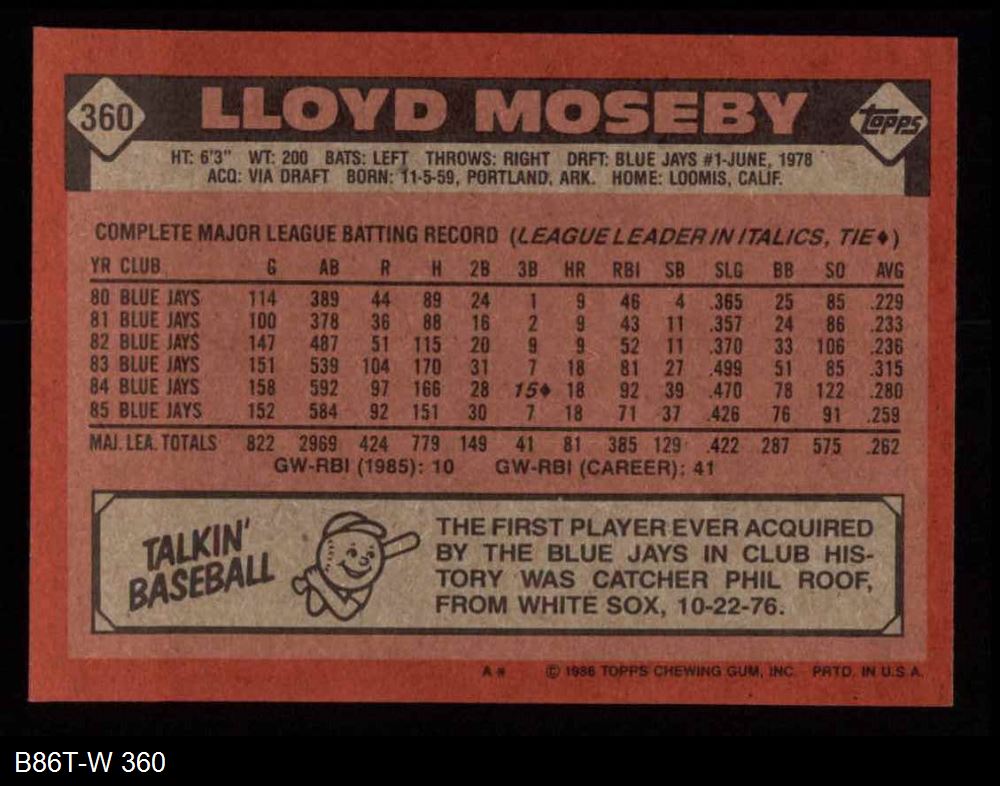 1986 Topps #360 Lloyd Moseby 8 - NM/MT