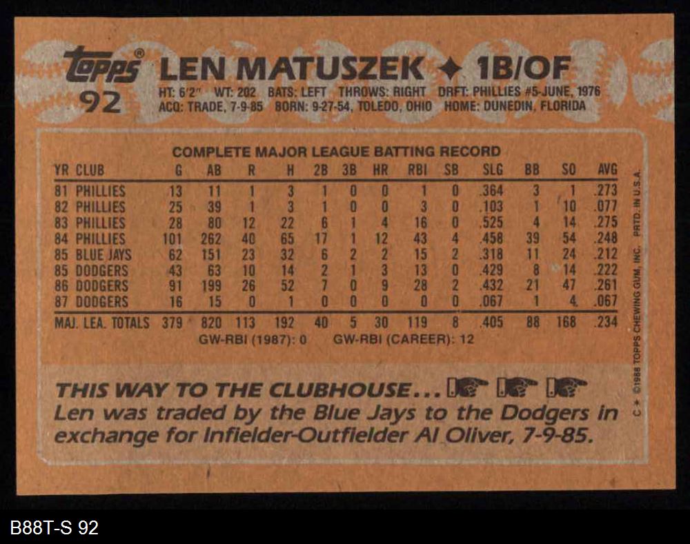 1988 Topps #92 Len Matuszek