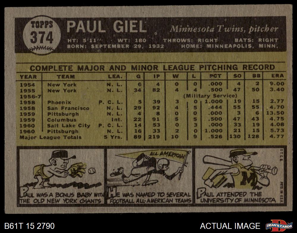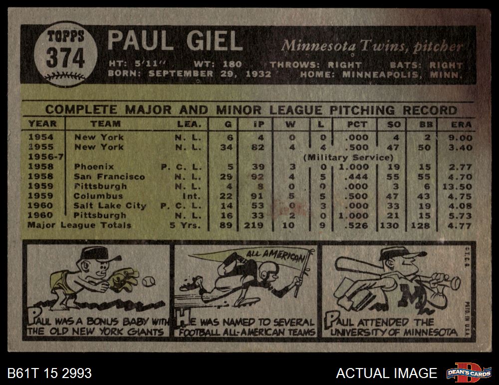 1961 Topps #374 Paul Giel