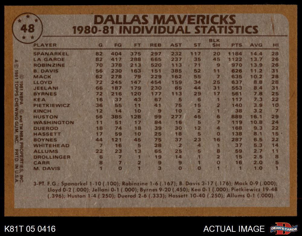 1981 Topps #48 - Jim Spanarkel / Tom LaGarde / Brad Davis Mavericks Leaders 8 - NM/MT