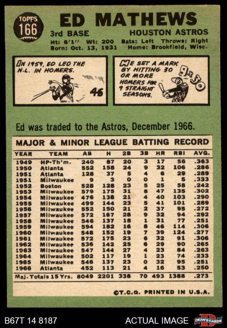 1967 Topps #166 Eddie Mathews 5 - EX