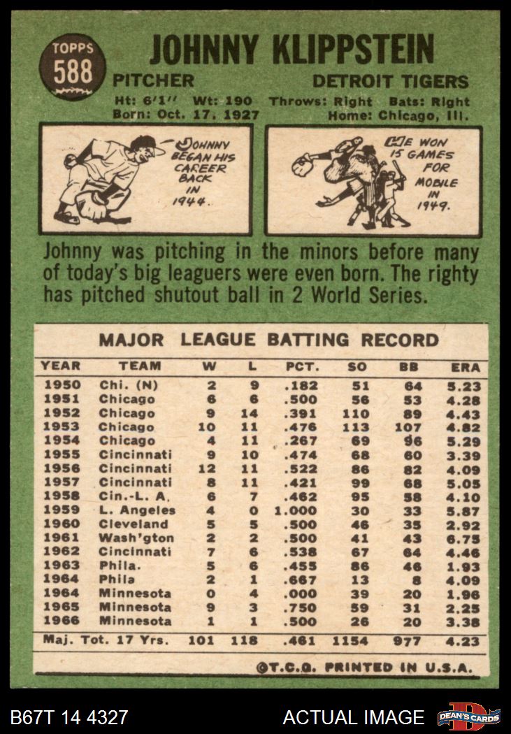 1967 Topps #588 Johnny Klippstein 8 - NM/MT