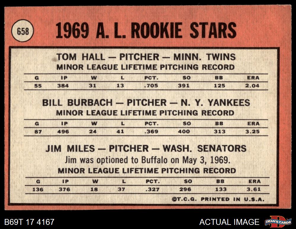 1969 Topps #658 - Bill Burbach / Tom Hall / Jim Miles AL Rookies 4 - VG/EX