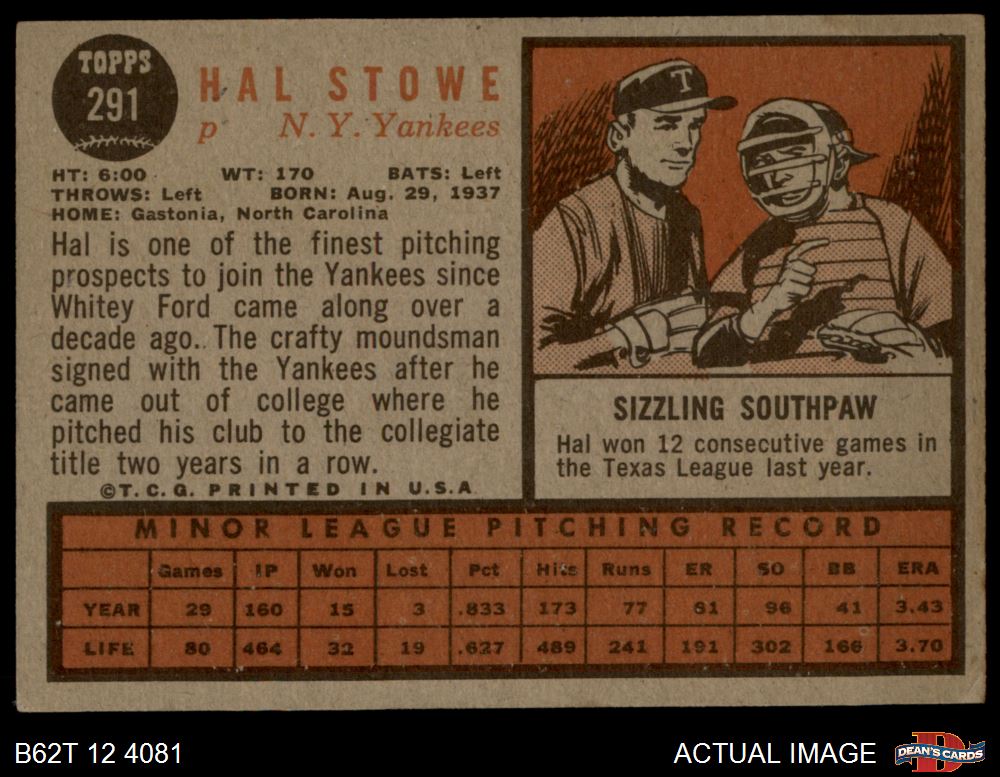 1962 Topps #291 Hal Stowe 4 - VG/EX