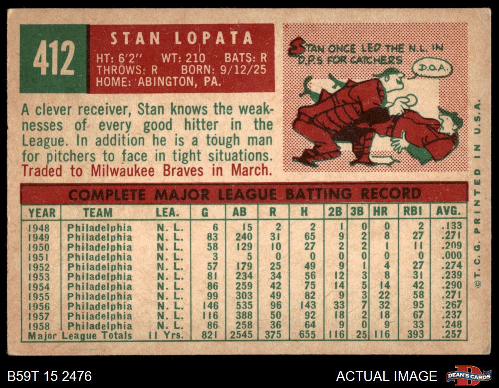 1959 Topps #412 Stan Lopata 3 - VG