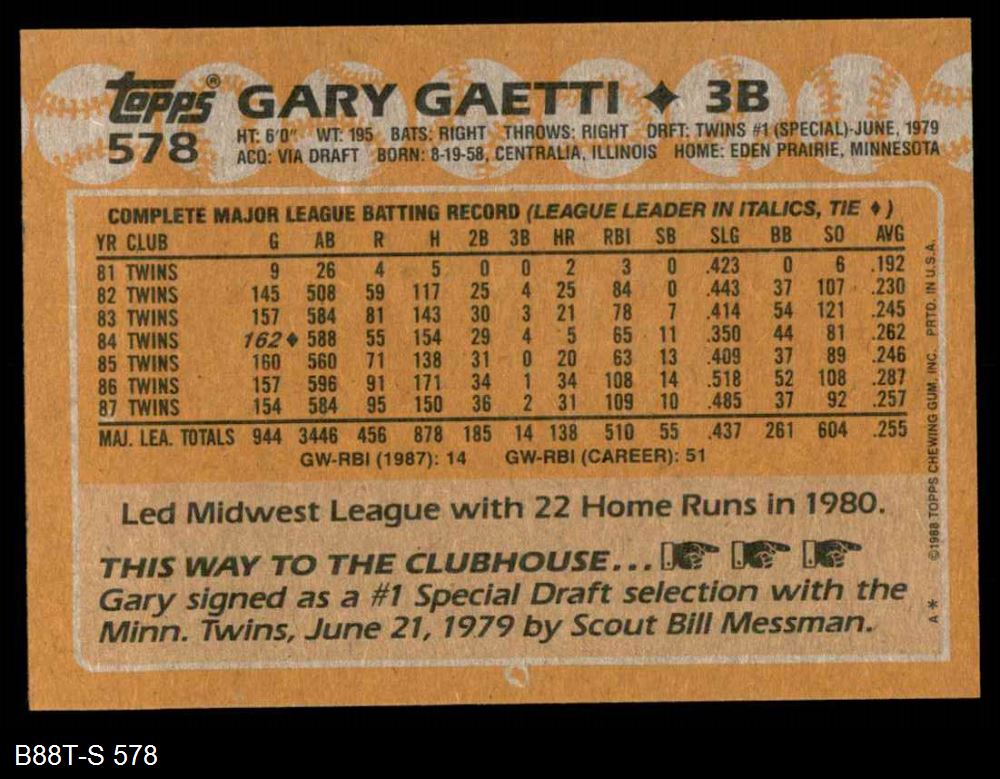 1988 Topps #578 Gary Gaetti 8 - NM/MT