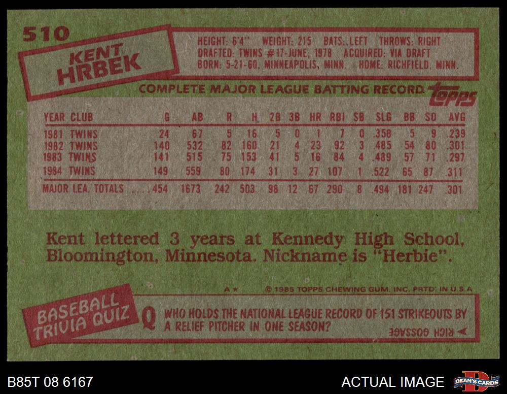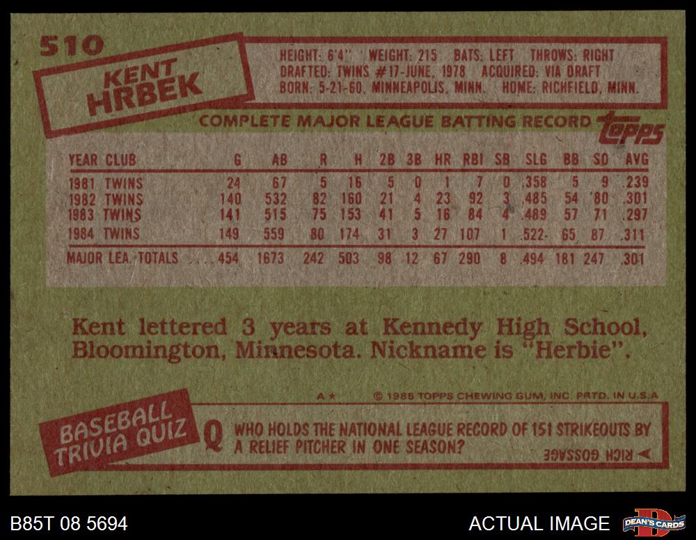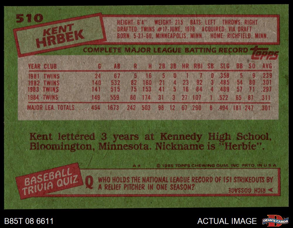 1985 Topps #510 Kent Hrbek