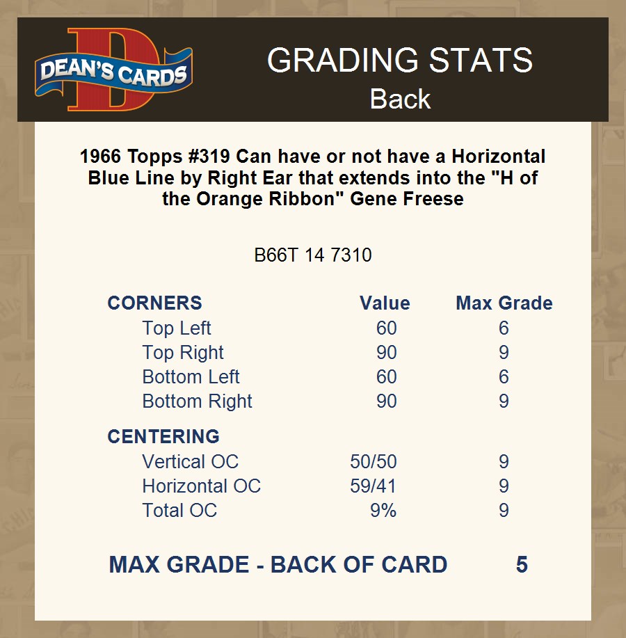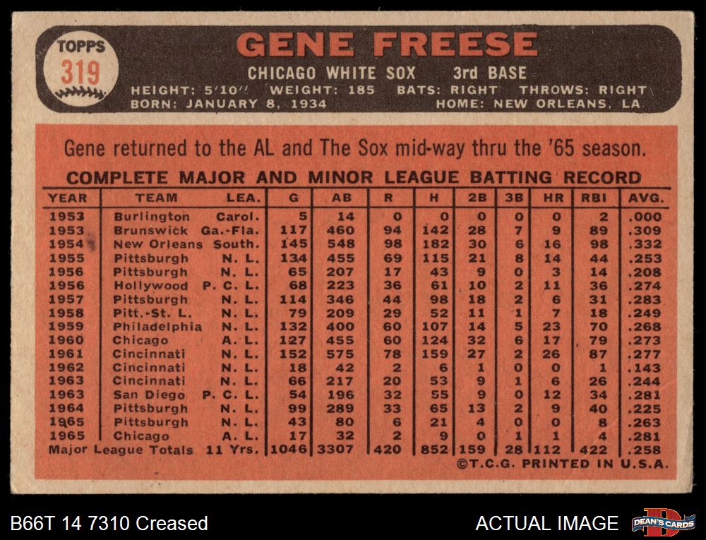 1966 Topps #319 Can have or not have a Horizontal Blue Line by Right Ear that extends into the "H of the Orange Ribbon" Gene Freese Front Thumbnail