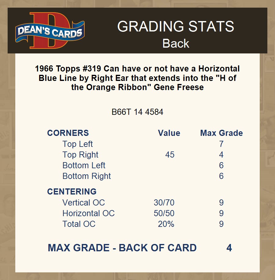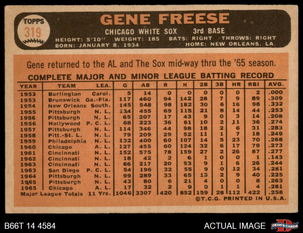 1966 Topps #319 Can have or not have a Horizontal Blue Line by Right Ear that extends into the "H of the Orange Ribbon" Gene Freese 3 - VG