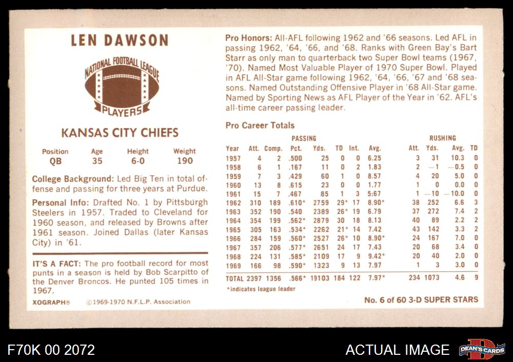 1970 Kellogg's #6 Len Dawson
