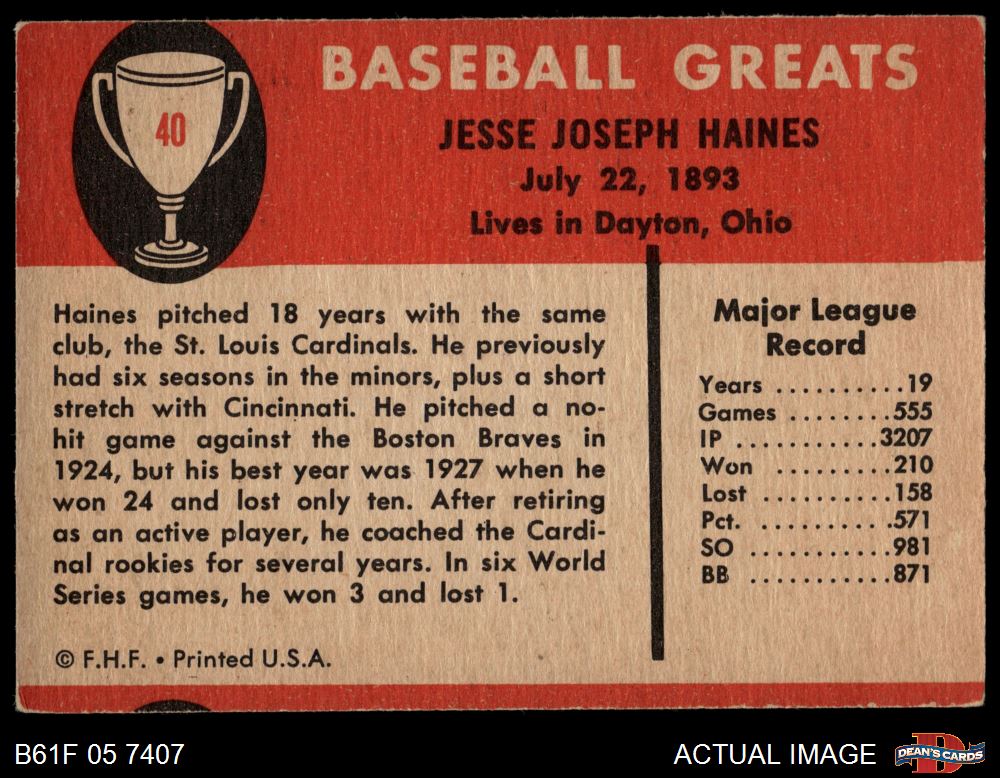 1961 Fleer #40 Jesse Haines