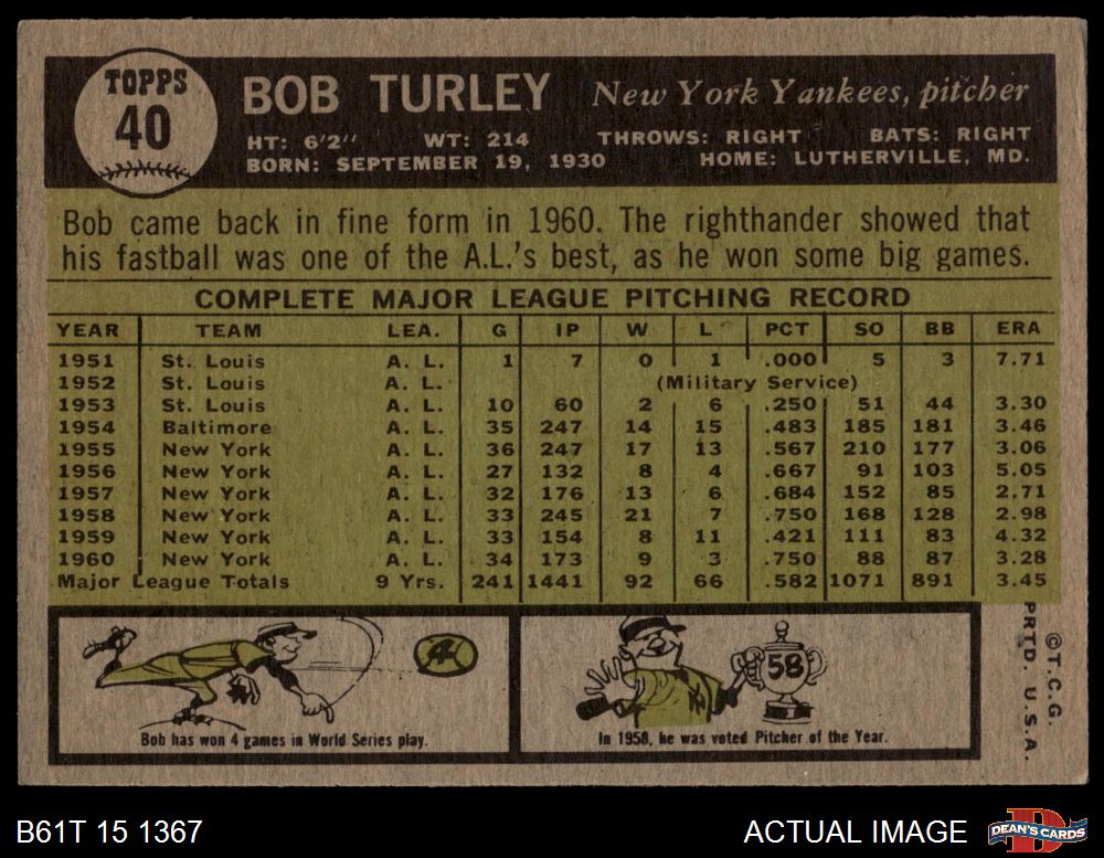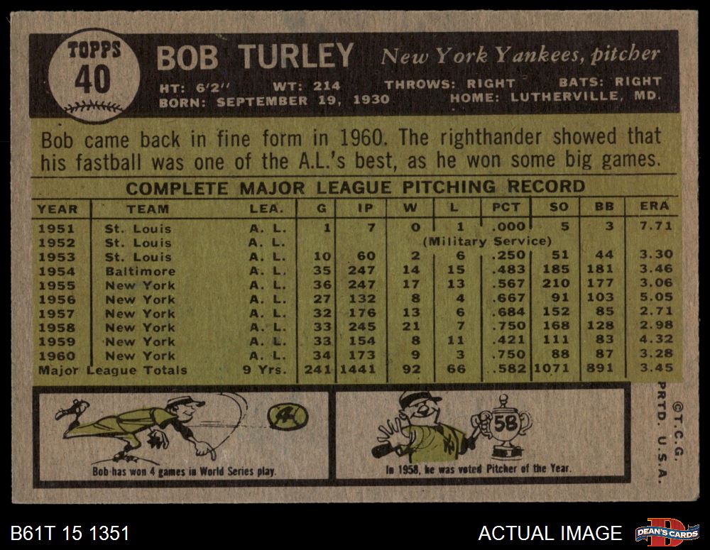 1961 Topps #40 Bob Turley 4.5 - VG/EX+