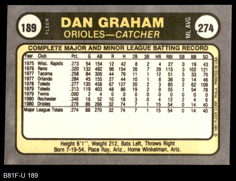 1981 Fleer #189 Dan Graham 8 - NM/MT