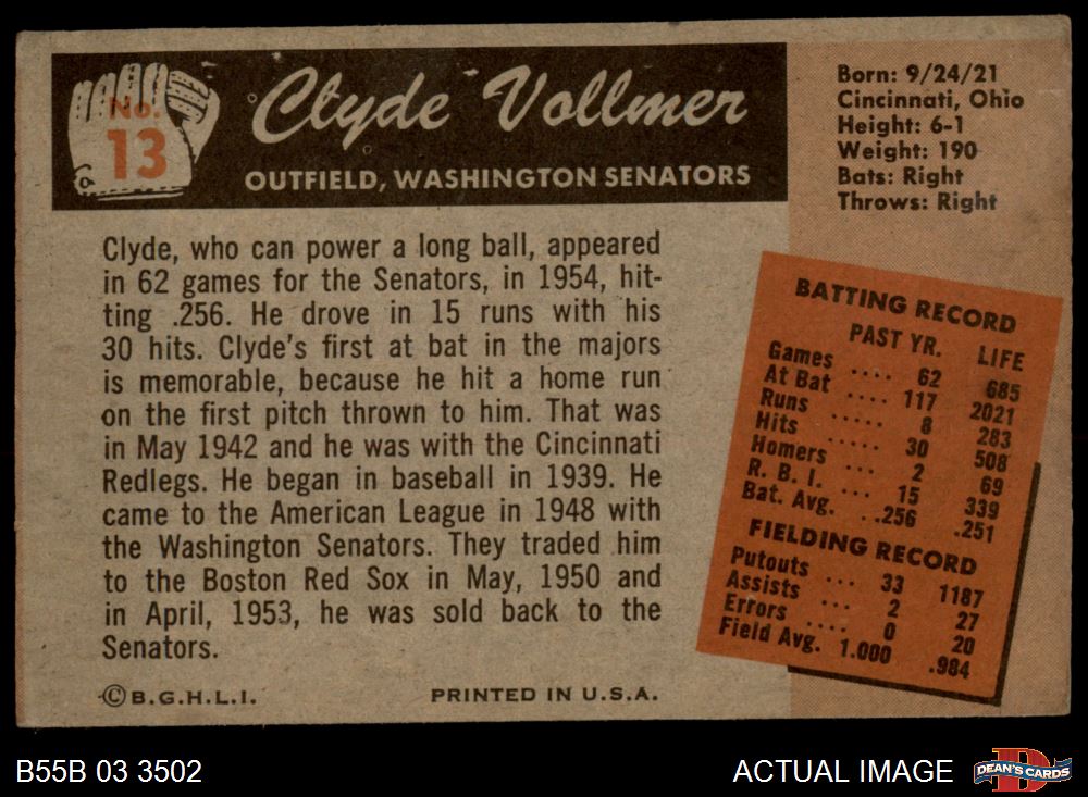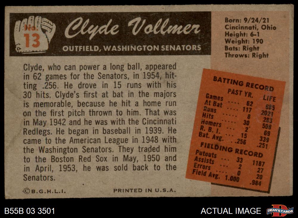 1955 Bowman #13 Clyde Vollmer 4 - VG/EX