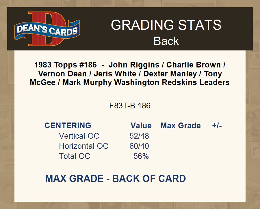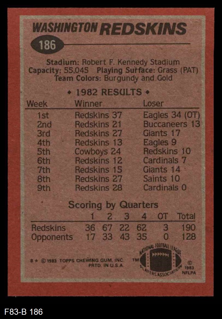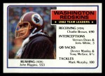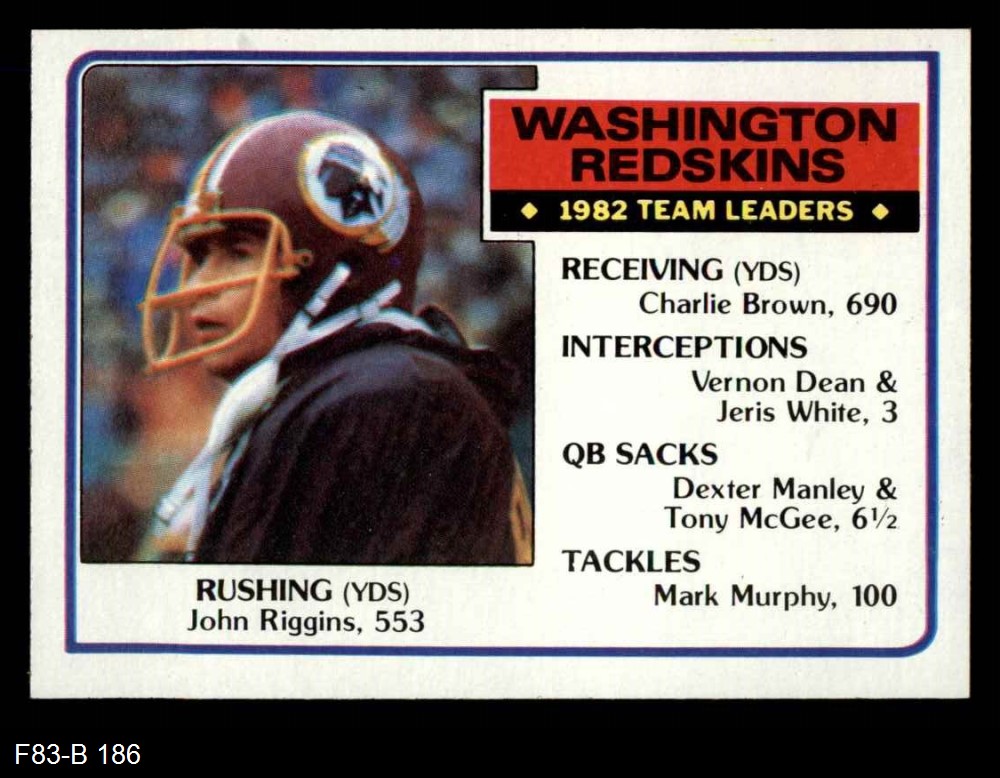 1983 Topps #186 - John Riggins / Charlie Brown / Vernon Dean / Jeris White / Dexter Manley / Tony McGee / Mark Murphy Washington Redskins Leaders 8 - NM/MT