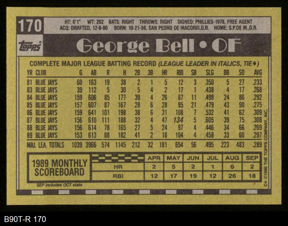 1990 Topps #170 George Bell 8 - NM/MT