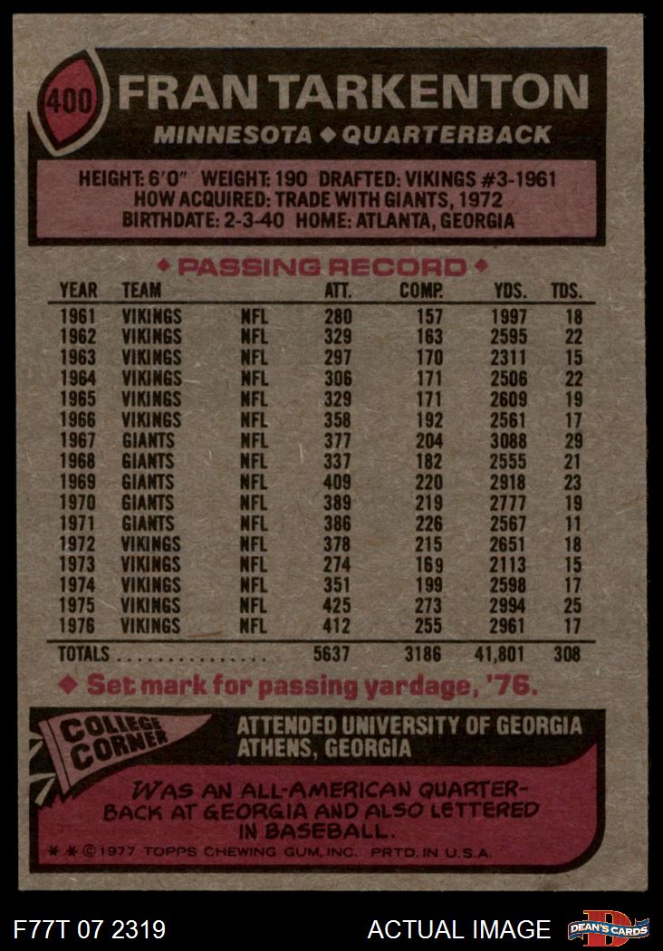 1977 Topps #400 Fran Tarkenton 5 - EX