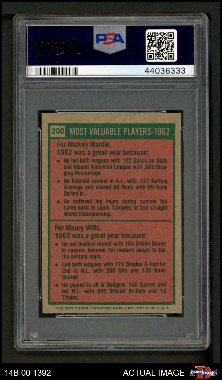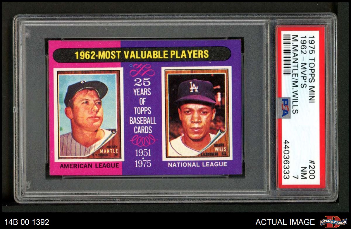 1975 Topps Mini #200 - Mickey Mantle / Maury Wills 1962 MVPs PSA 7 - NM