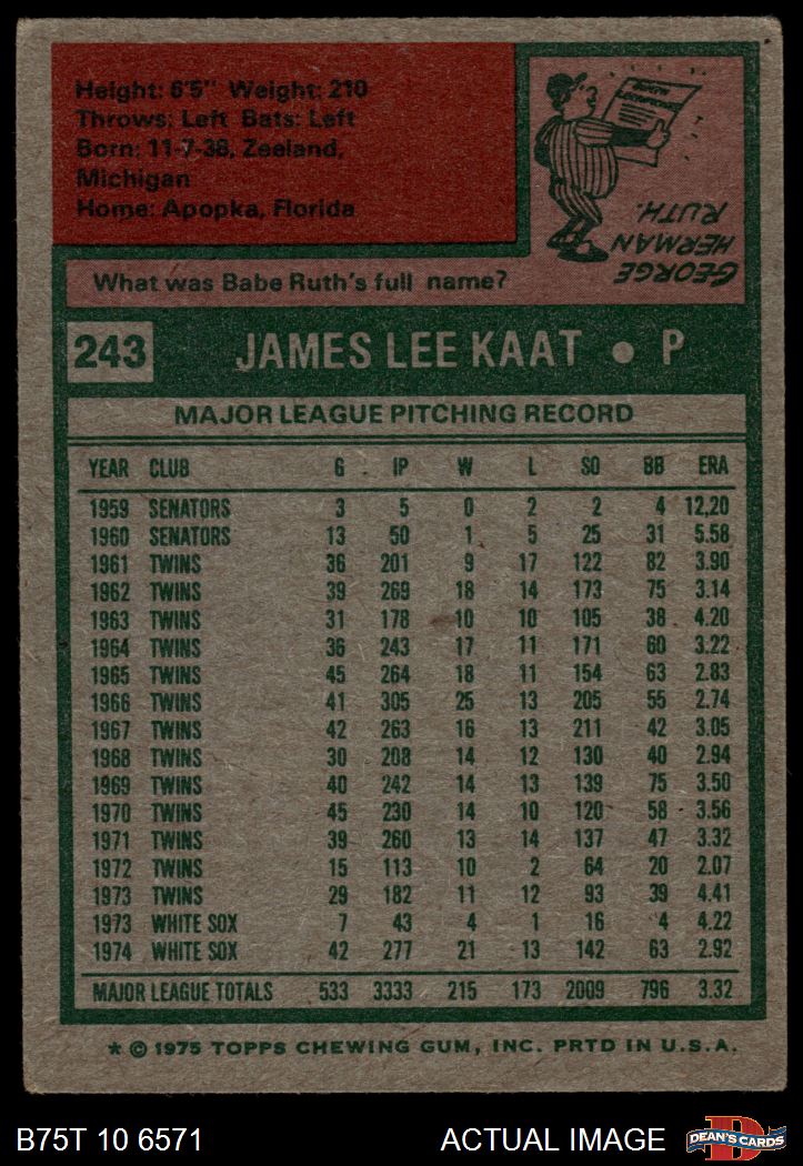 1975 Topps #243 Jim Kaat 3 - VG