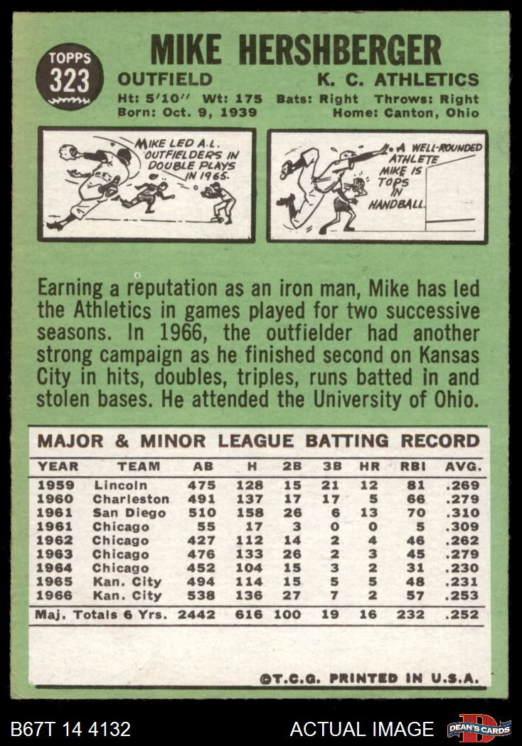 1967 Topps #323 Mike Hershberger 6 - EX/MT