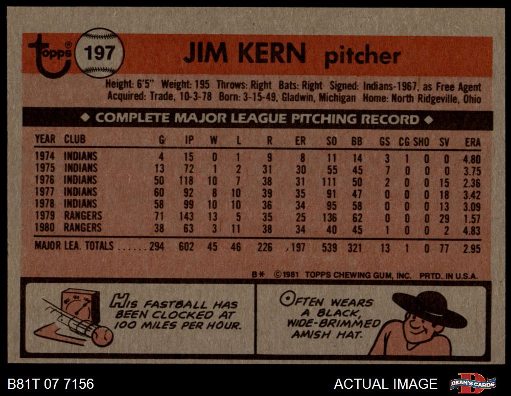 1981 Topps #197 Jim Kern 6 - EX/MT