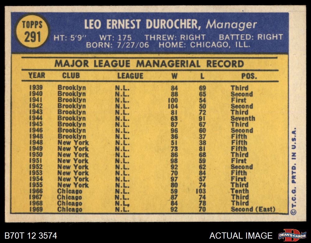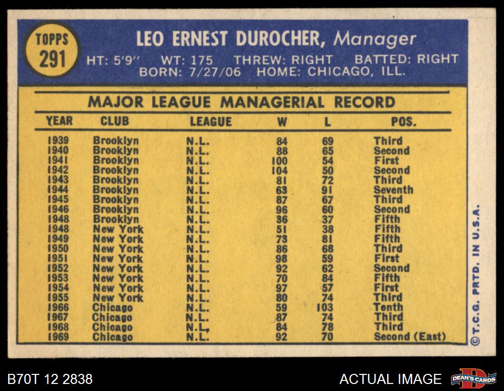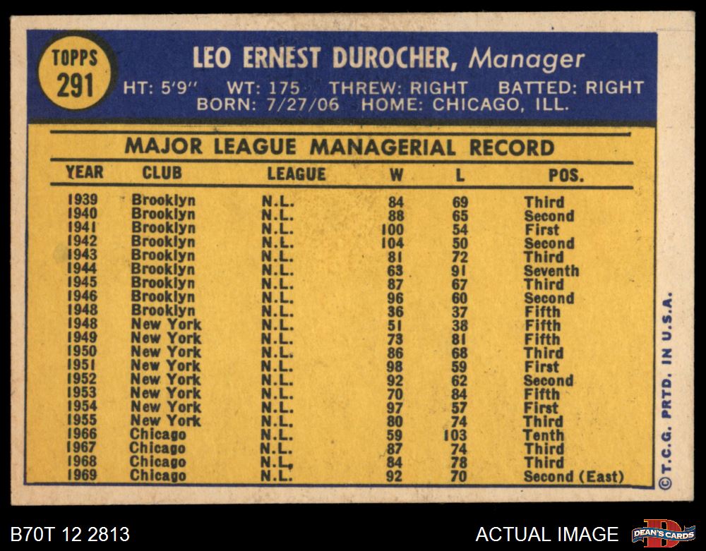 1970 Topps #291 Leo Durocher 6 - EX/MT