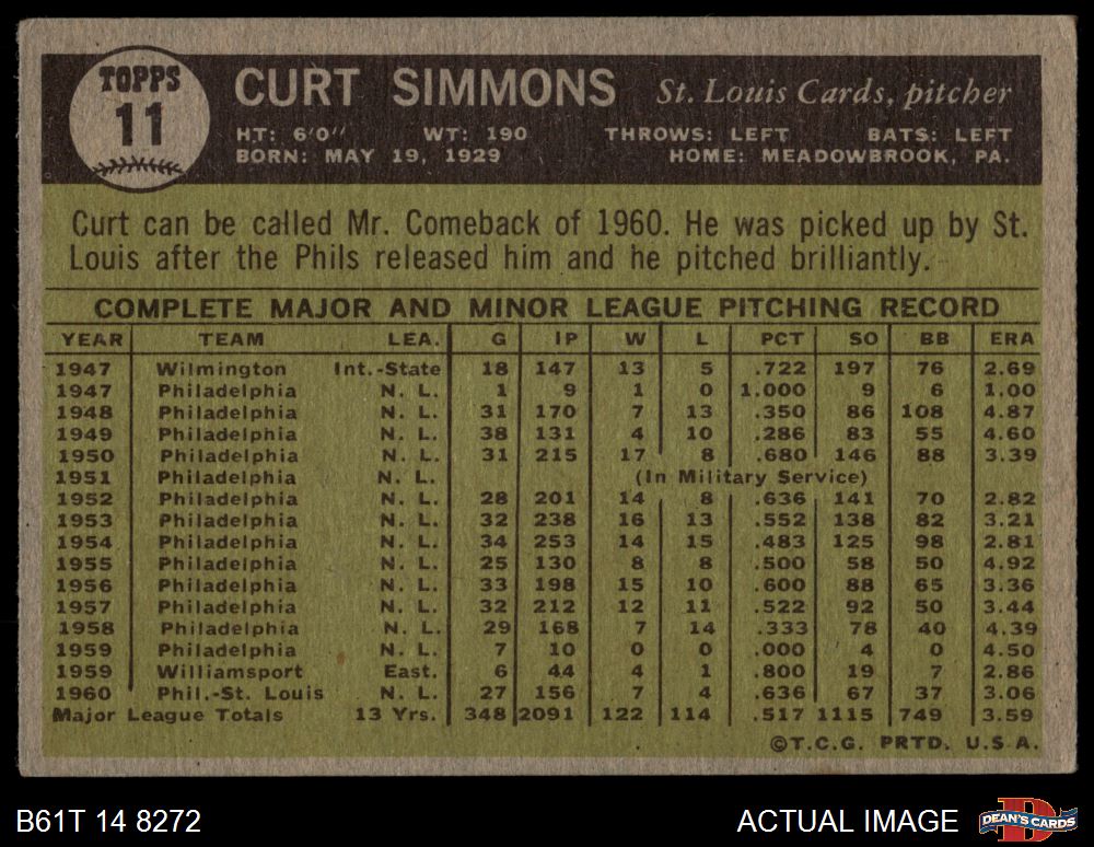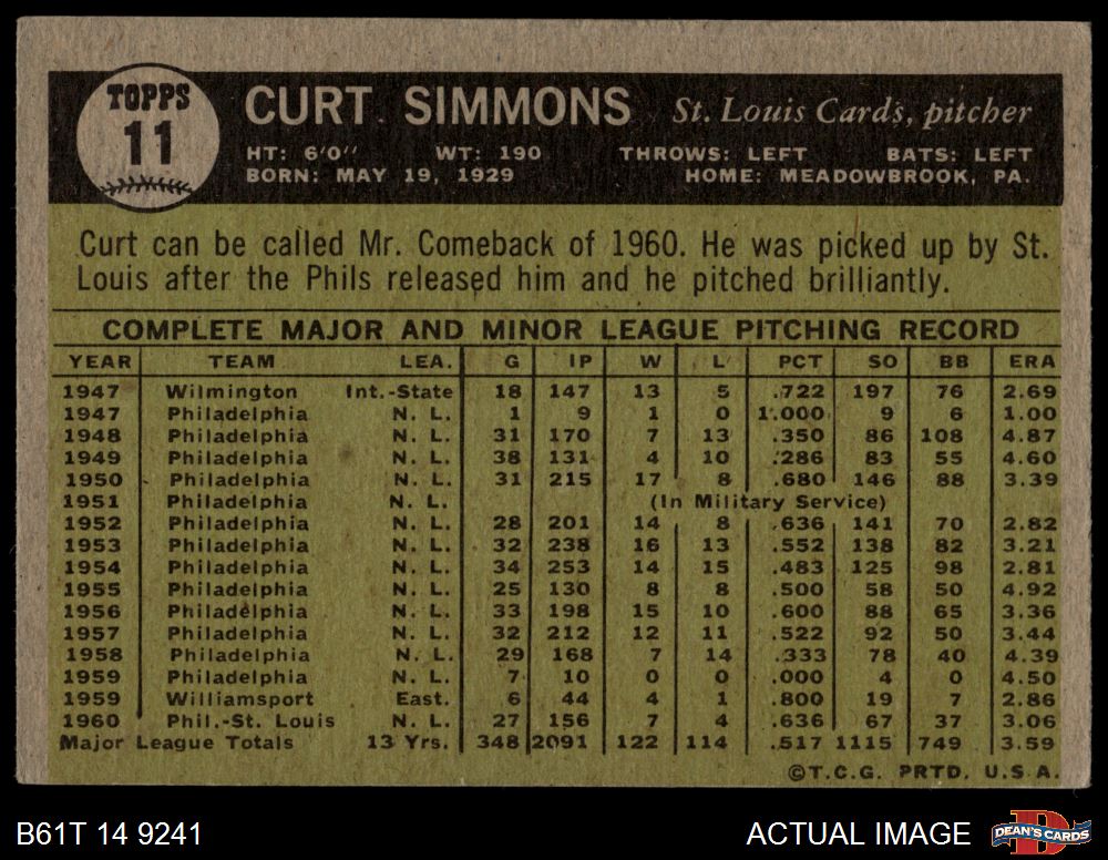 1961 Topps #11 Curt Simmons
