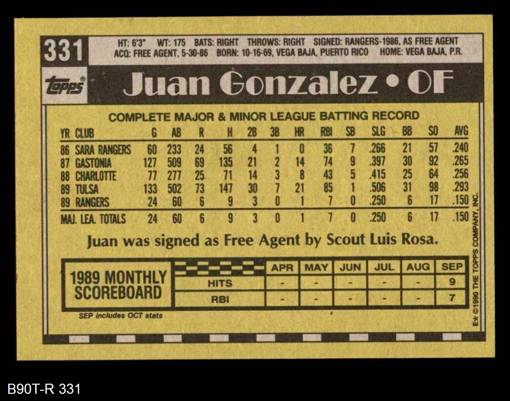 1990 Topps #331 Juan Gonzalez 8 - NM/MT