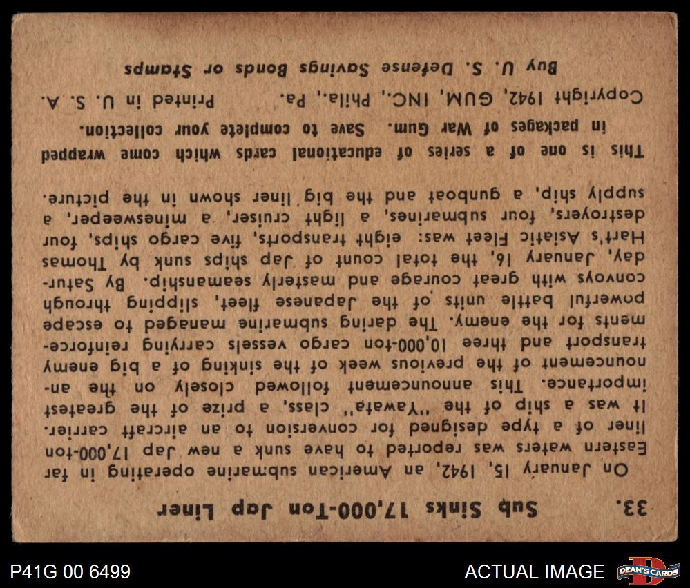1941 War Gum #33 Sub Sinks 17000-Ton Japanese Liner