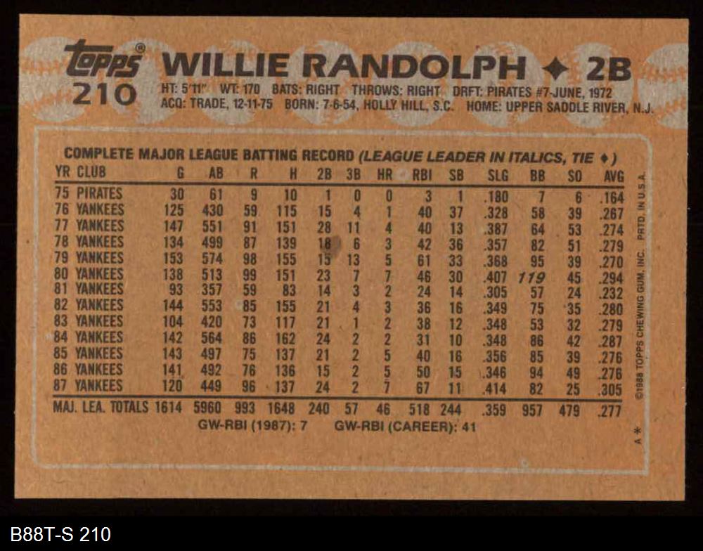 1988 Topps #210 Willie Randolph