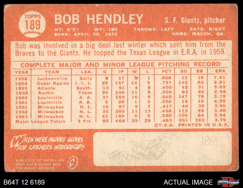 1964 Topps #189 Bob Hendley Front Thumbnail