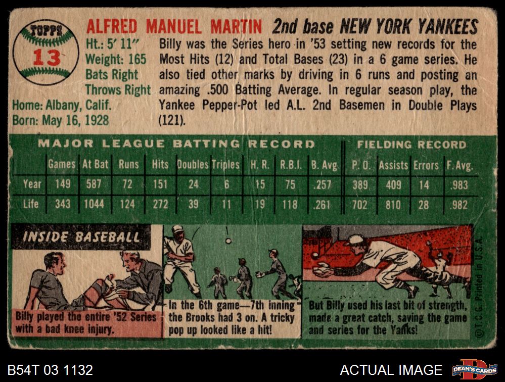 1954 Topps #13 WHT Billy Martin AUTHENTIC