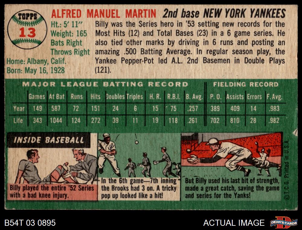 1954 Topps #13 WHT Billy Martin 3 - VG