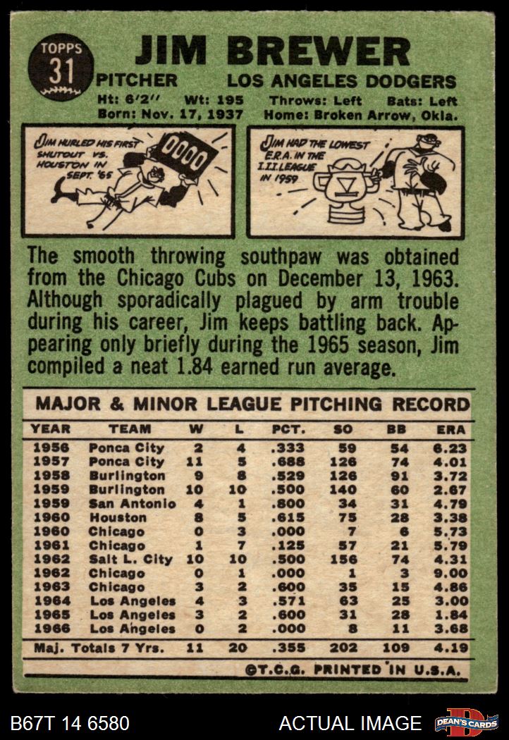 1967 Topps #31 Jim Brewer 3 - VG