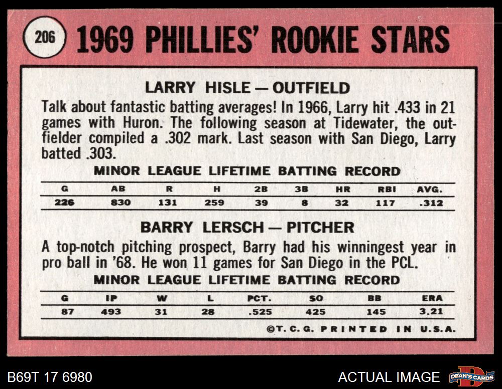 1969 Topps #206 - Larry Hisle / Barry Lersch Phillies Rookies 6.5 - EX/MT+