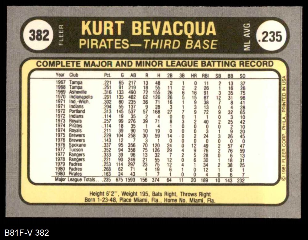1981 Fleer #382 ERR Kurt Bevacqua