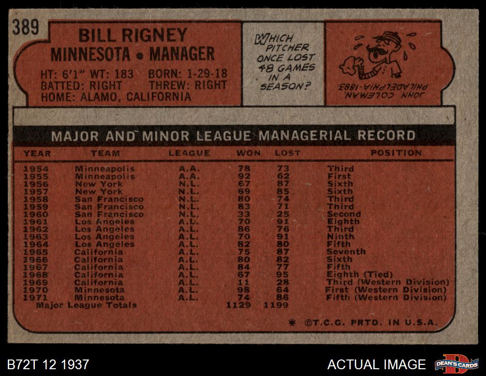 1972 Topps #389 Bill Rigney 4 - VG/EX
