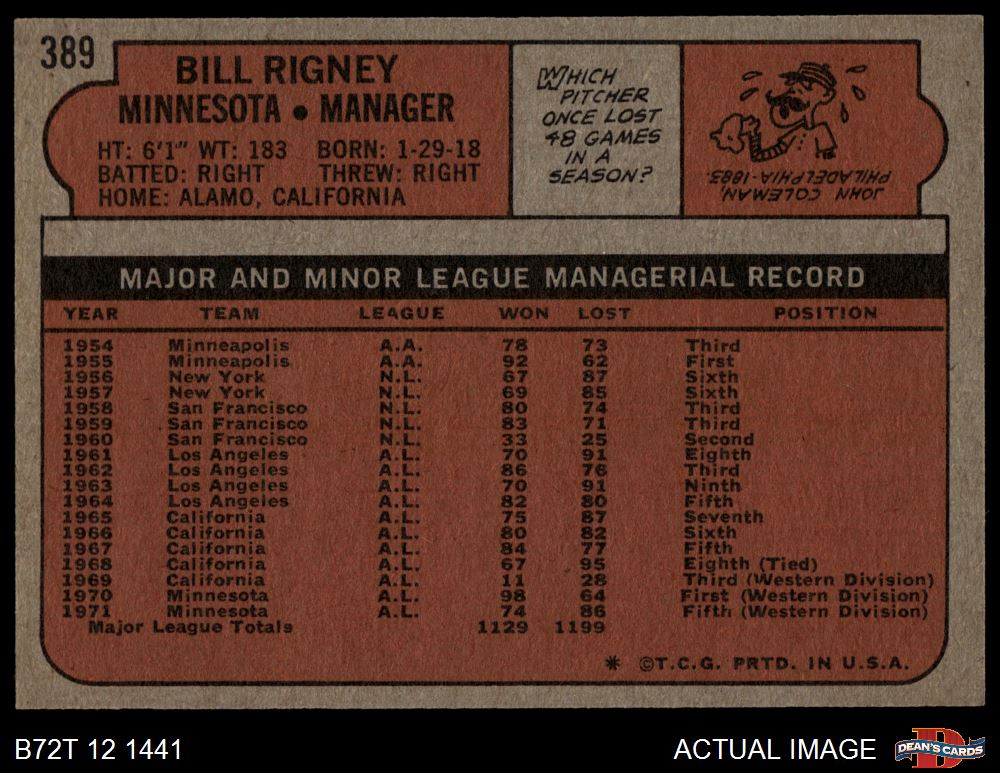 1972 Topps #389 Bill Rigney 8 - NM/MT