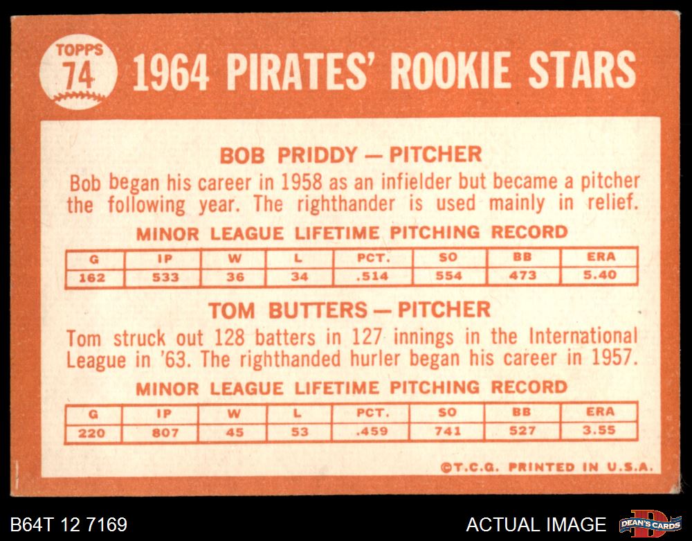 1964 Topps #74 - Bob Priddy / Tom Butters Pirates Rookies 3 - VG