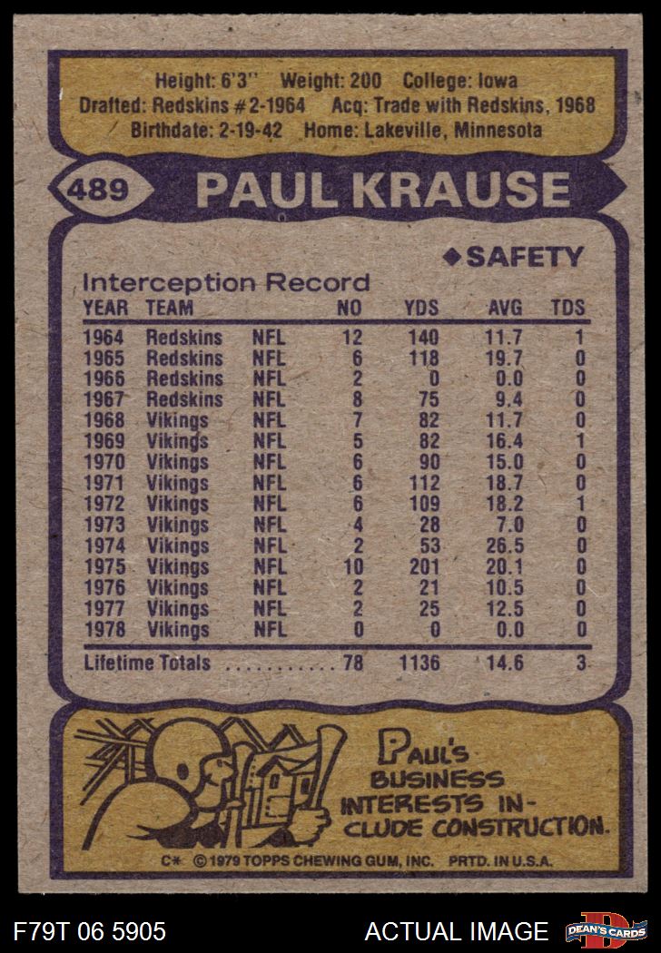 1979 Topps #489 Paul Krause 7 - NM