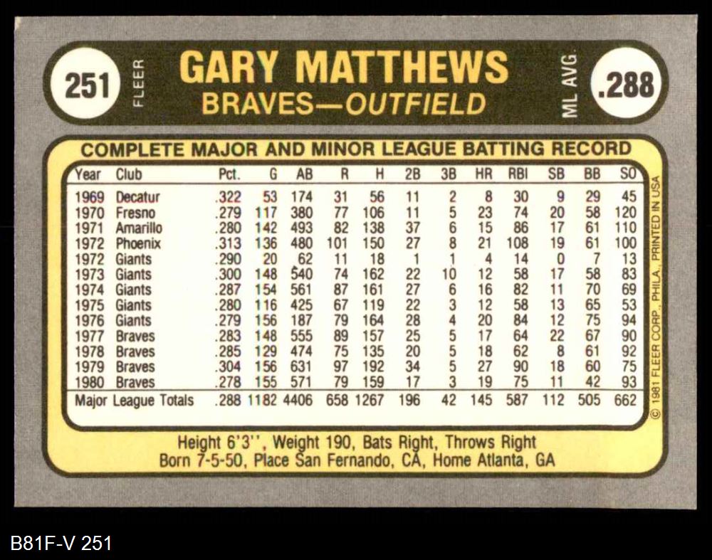 1981 Fleer #251 xHAND Gary Matthews 8 - NM/MT