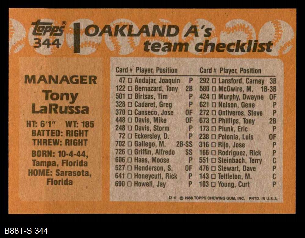 1988 Topps #344 Tony La Russa 8 - NM/MT