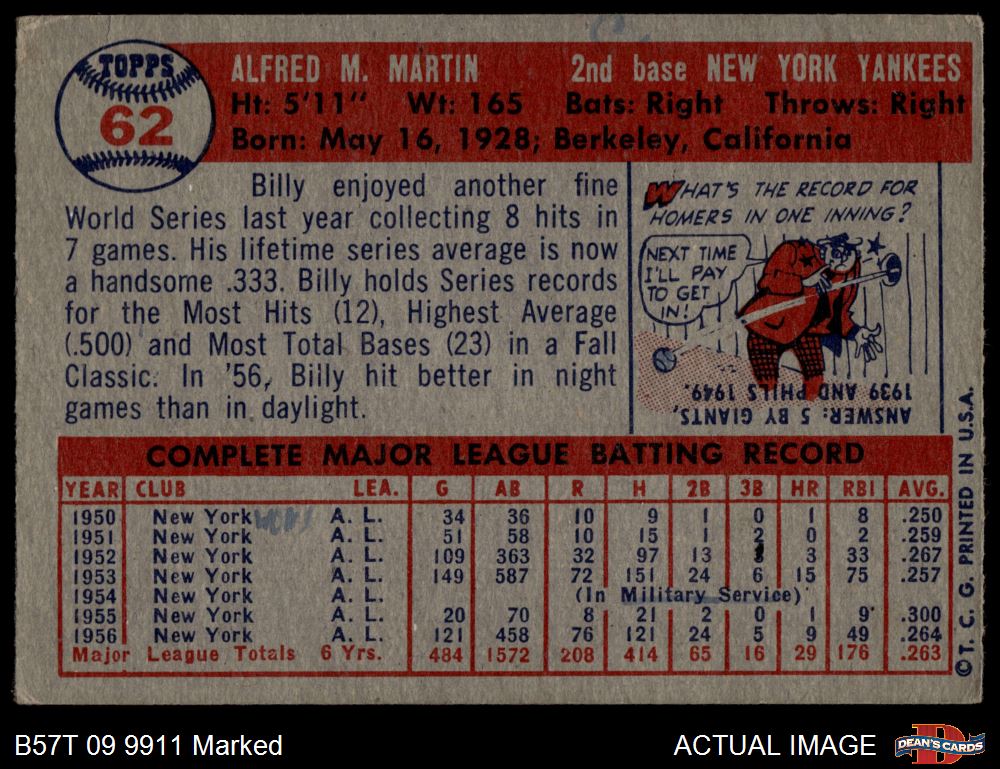 1957 Topps #62 Billy Martin Front Thumbnail