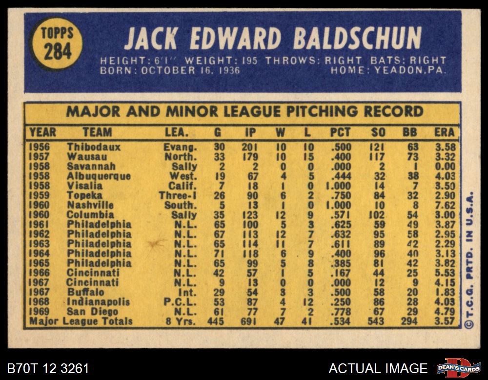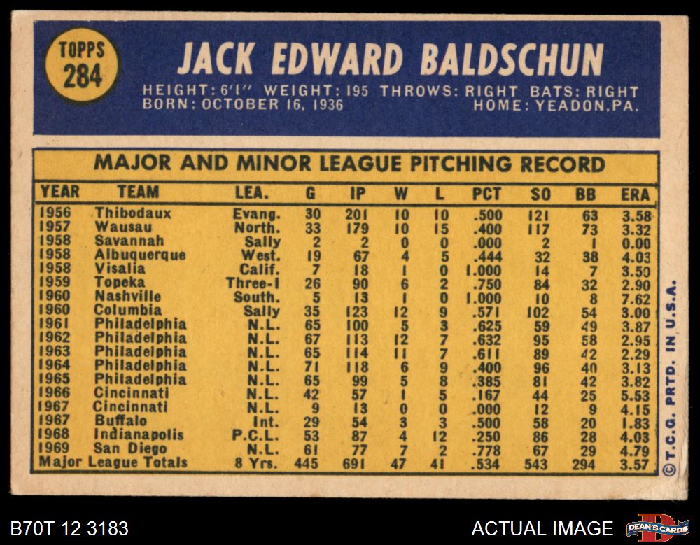 1970 Topps #284 Jack Baldschun 4 - VG/EX