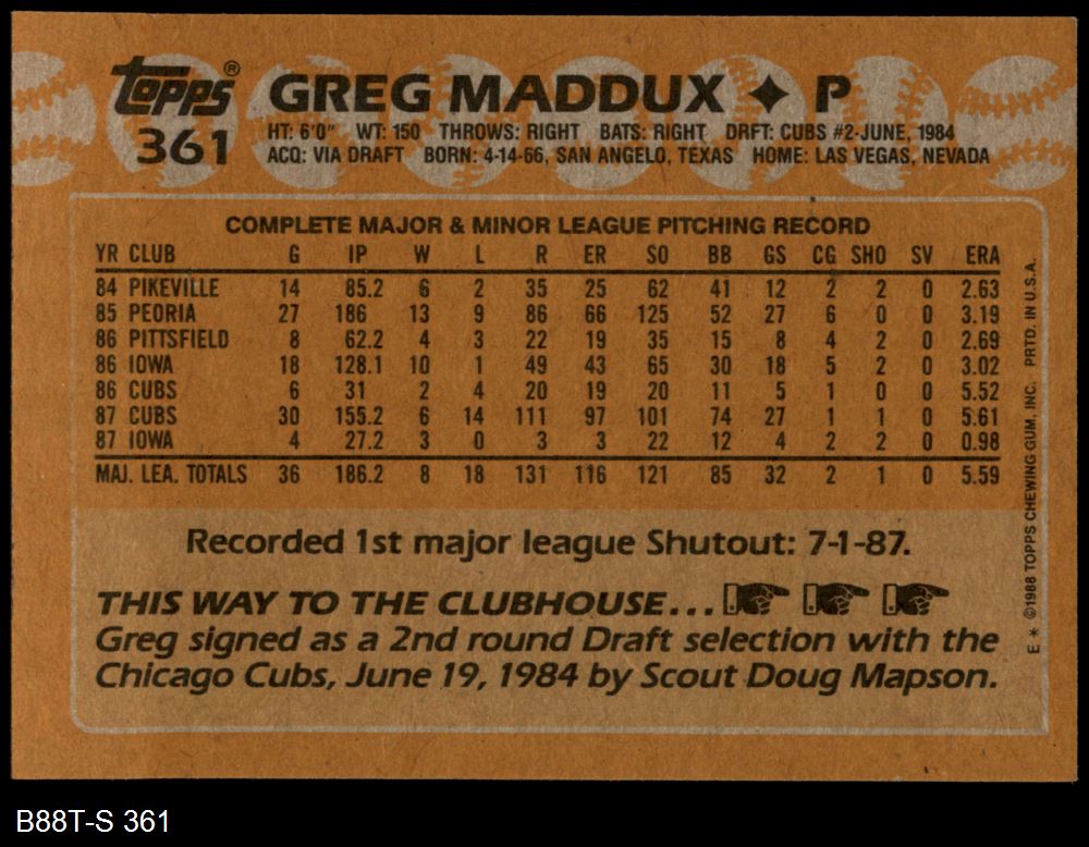 1988 Topps #361 Greg Maddux 8 - NM/MT
