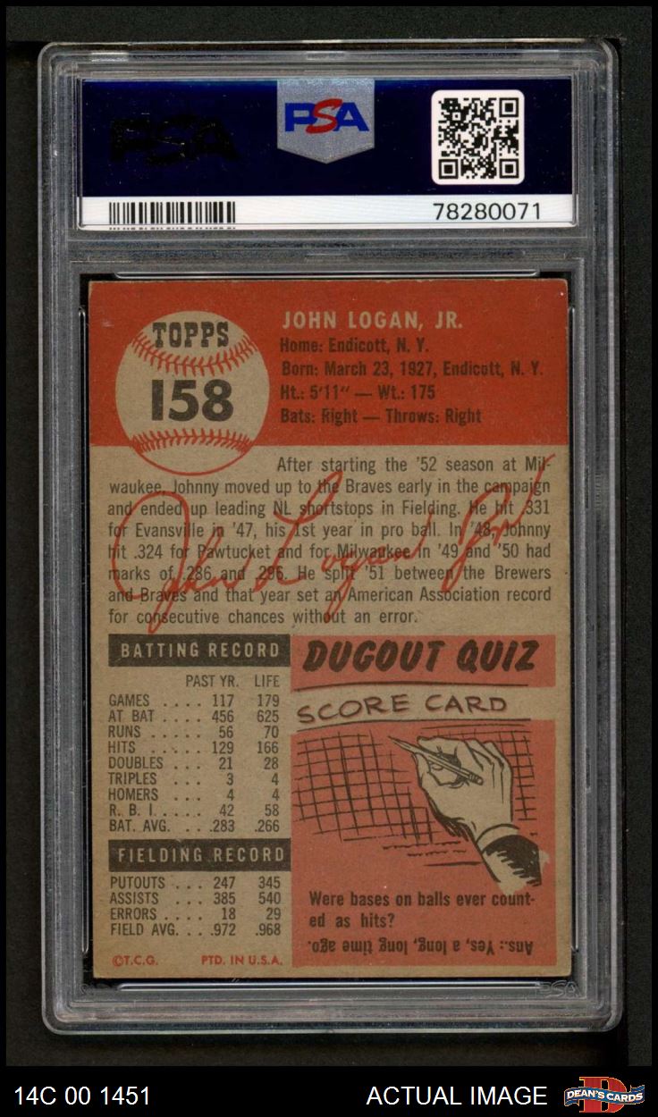 1953 Topps #158 Johnny Logan PSA 5 - EX
