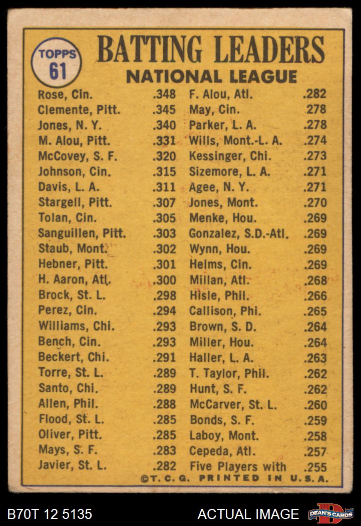 1970 Topps #61 - Roberto Clemente / Pete Rose / Cleon Jones NL Batting Leaders 3 - VG